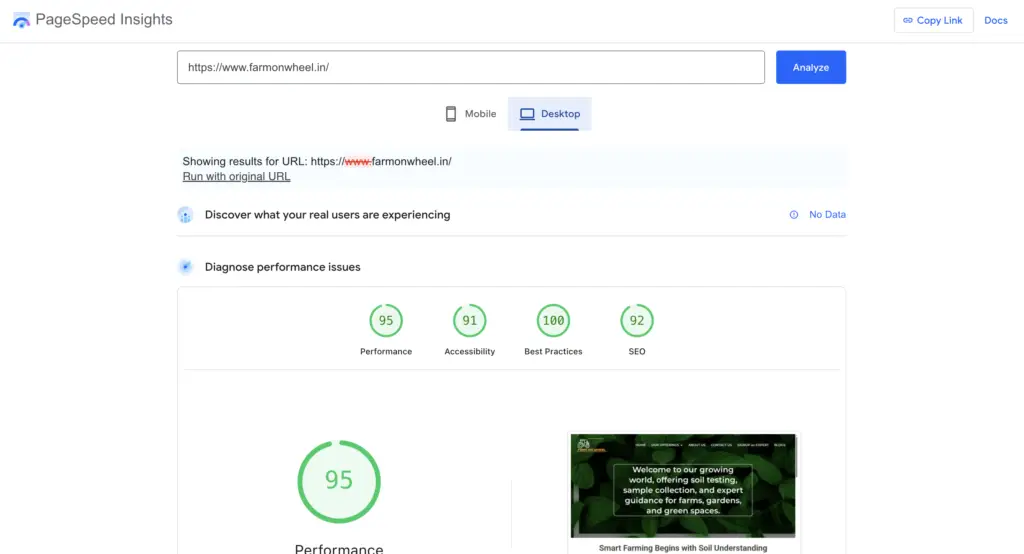 For FarmOnWheel, I focused on both design and performance. Using Google PageSpeed Insights, I optimized the site for faster loading, mobile responsiveness, and better user experience.